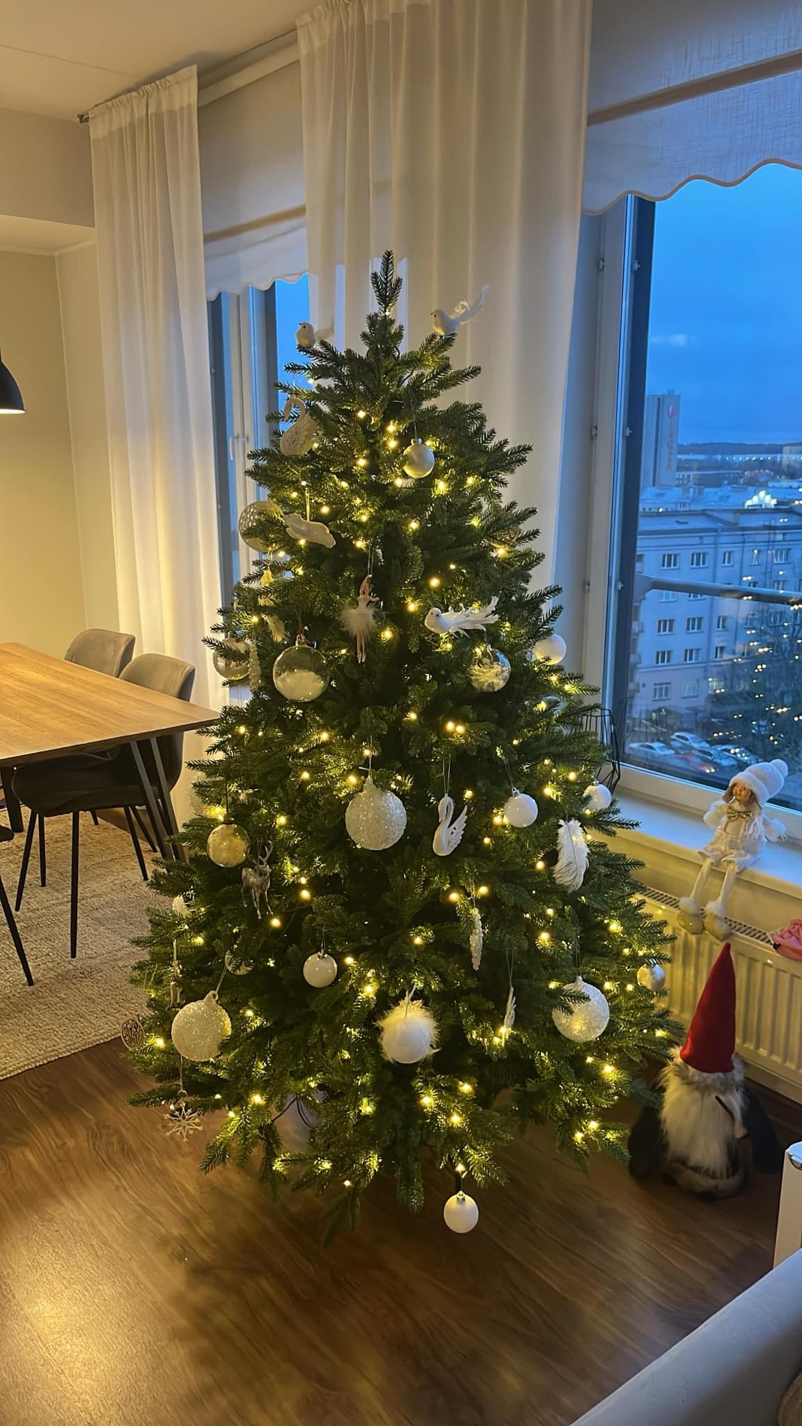 Pūkaina, blīva un uzkrītoša mākslīgā Freizer egle ar LED lampiņām.